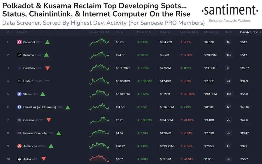Na czele listy są protokoły Polkadot ($DOT) informatyka Gavina Wooda wraz z kluczowym projektem ekosystemu: Kusama ($KSM), dzieląc pomiędzy siebie pierwsze dwa miejsca na podium z najwyższą liczbą commitów w Githubie – każdy z nich może pochwalić się imponującą liczbą 551 aktualizacji w ciągu ostatnich 30 dni.