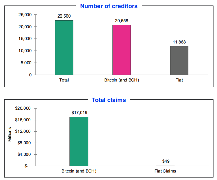Według danych z rapoortu (sierpień 2022) łącznie 22 560 indywidualnych wierzycieli zostało uznanych przez syndyka. Aż 20.658 z nich posiada roszczenia w BTC, a 11 868 zgłosiło również roszczenia w walucie fiat (ponieważ wielu wierzycieli ma zarówno roszczenia w BTC, jak i fiat). Łączna kwota roszczeń