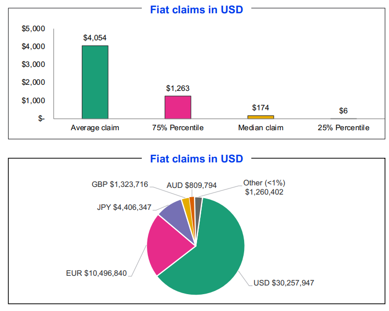 W porównaniu z roszczeniami w BTC (oraz BCH), roszczenia w walutach fiducjarnych są stosunkowo niewielkie, opiewają łącznie na ok 48 mln USD w 19 różnych walutach od dolara amerykańskiego do duńskich koron. Jednakże tylko USD, EUR, JPY są walutami z roszczeniami o wartości przekraczającej 1 mln USD. Głównym powodem dużej różnicy między roszczeniami BTC i fiatów jest ogromny wzrost ceny Bitcoina od czasu upadku MtGox.