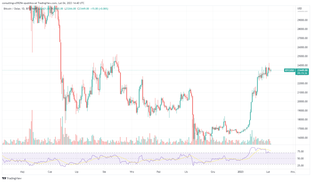 Może się jeszcze zdarzyć, iż chętni na kupno Bitcoinów mogą mieć swoją szansę „załadować się” po kursie poniżej 22 000 USD. Mówi analityk, na podstawie podanych ostatnio danych o rekordowym spadku poziomu bezrobocia w USA. Recesja w USA nie jest już taka oczywista i spadek wartości dolara na razie został zatrzymany. Cena Bitcoina spadła przed otwarciem Wall Street 3 lutego, gdy pojawiły się nowe dane gospodarcze ze Stanów Zjednoczonych.