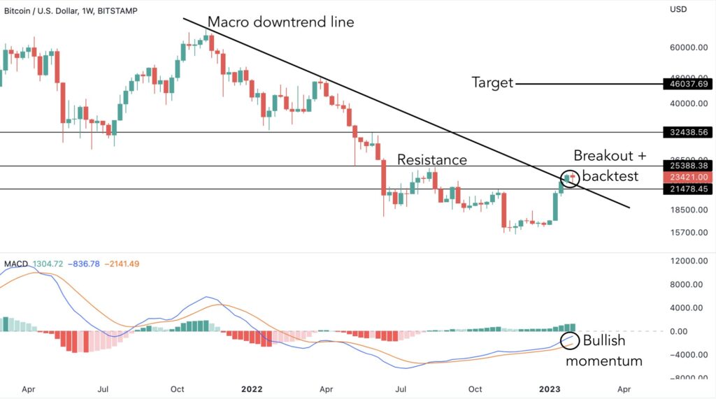 „BTC odnotowało czyste wybicie powyżej linii trendu spadkowego w skali makro + test wsteczny”, stwierdził Game of Trades, źródło badań inwestycyjnych.
