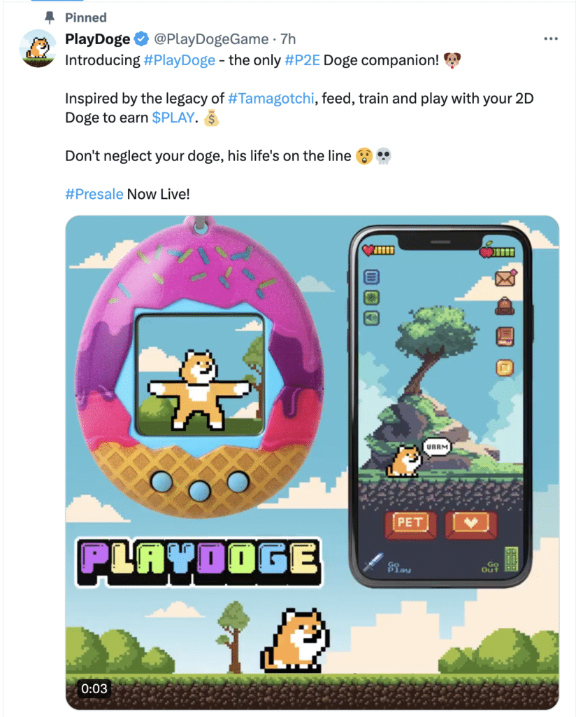 PlayDoge zaskakuje swoją nietypową formą: to gra mobilna, która przemienia ikonę Doge w wirtualnego zwierzaka, którego znamy z zabaw typu Tamagotchi. Chociaż PlayDoge pozostaje monetą memową, głównym założeniem deweloperów jest korzystanie z użytkowości gry, przede wszystkim tych znanych z lat 90 w wersji 2D.