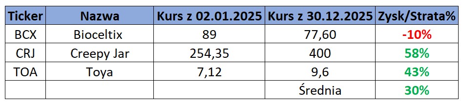 Rok 2025 otworzyliśmy z myślą, iż przy odpowiednim wyborze spółek z polskiej giełdy można zbudować portfel, który przyniesie realne zyski. W publikacji „3 typy inwestycyjne na 2025 rok” przedstawiłem trzy spółki — Bioceltix, Creepy Jar i Toya.