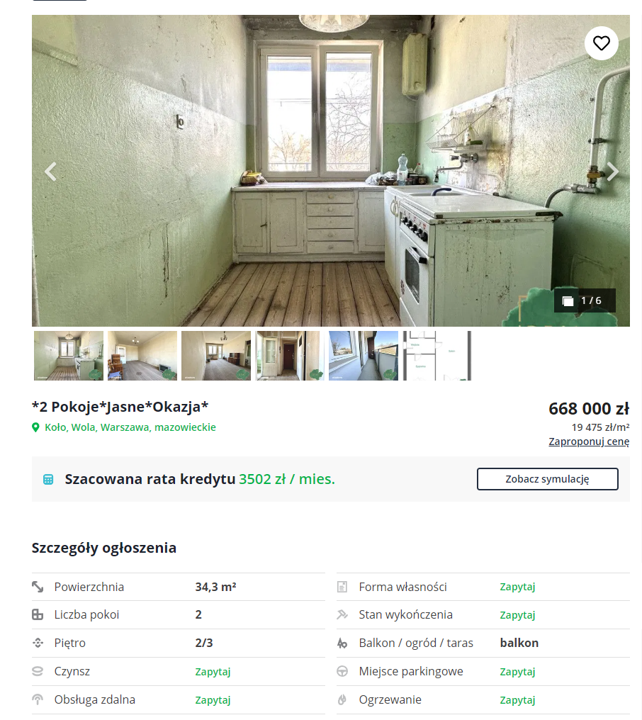 Jacek Gadzinowski na portalu społecznościowym X (dawniej Twitterze) opisał interesujące ogłoszenie z serwisu obrotu nieruchomościami otodom.pl: kawalerka 34 metry kwadratowe na Woli w Warszawie, blisko 20 tys. za metr, „możliwość podzielenia na mikroapartamenty”. Szokujące? W stolicy już niestety nie do końca. To, co natomiast zwraca szczególną uwagę, to stan w jakim znajduje się ogłaszane mieszkanie.