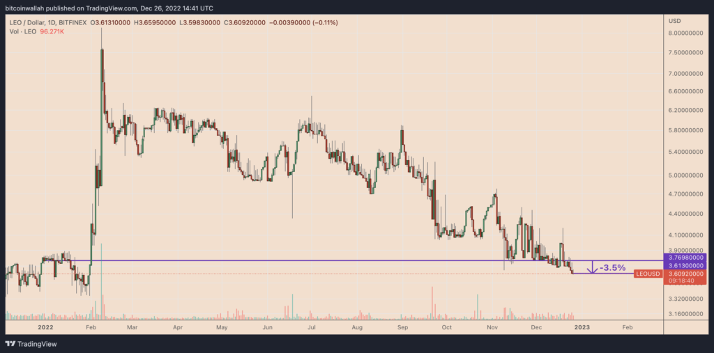 Rajd doprowadził cenę LEO do najwyższego poziomu od początku roku wynoszącego 8,15 USD w lutym. Jednak od tego czasu token spadł o 55%, choć przez cały czas pozostaje jednym z najlepszych w 2022 roku.