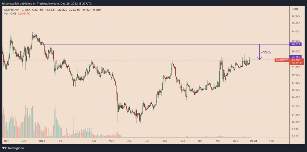 OKB rozwijał się synchronicznie z szerszym rynkiem kryptograficznym w 2022 r., i zanotował 150% odbicie po zanotowaniu dołku na poziomie około 9,50 USD w czerwcu. Bycze odbicie kursu tokena miało miejsce pomimo braku ważnego wydarzenia poruszającego rynek, co sugeruje, iż było to głównie spekulacyjne.