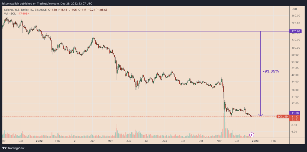 Solana SOL, protokół blockchain warstwy 1, załamał się o 93,35% YTD z powodu serii złych wiadomości w całym 2022 roku. Solana zaliczyła sześć awarii sieci w ciągu roku, włamanie o wartości 200 milionów dolarów na portfel oparty na Solanie i nieszczęśliwe powiązanie Solany z FTX.