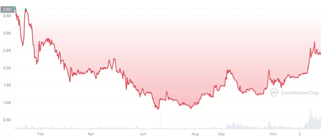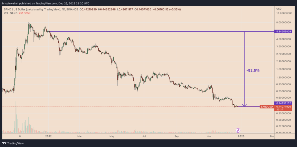 Niższa frekwencja wpłynęła na brak popytu na tokeny SAND na giełdach spot, co z kolei obniżyło jego cenę o 93,50% YTD, jak pokazano poniżej. Inne czynniki stojące za spadkiem oprocentowania obejmują ogólny brak popytu na bardziej ryzykowne aktywa w środowisku wyższych stóp procentowych.