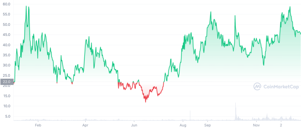 Unus Sed Leo (LEO) pochodzi z ekosystemu iFinex. Token poniósł straty w 2022 r., ale przy -3,5% były one niewielkie w porównaniu z większością topowych coinów, w tym z Bitcoinem BTC i ETH, które w tym samym okresie stracił ponad 65%.