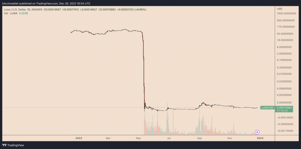 Terra LUNA jest wielką porażką sektora kryptowalut po tym, jak jej wycena rynkowa spadła o 99,99% w maju. Implozja algorytmicznego stablecoina TerraUSD (UST) jest jednym z największych upadków w historii branży kryptograficznej. Skłoniła jej założyciela Do Kwona do zasugerowania rozwidlenia, aby ożywić projekt. Ostatecznie Terra przeszła podział łańcucha, przy czym stary łańcuch funkcjonuje jako Terra Classic, a nowy jako Terra 2.0.