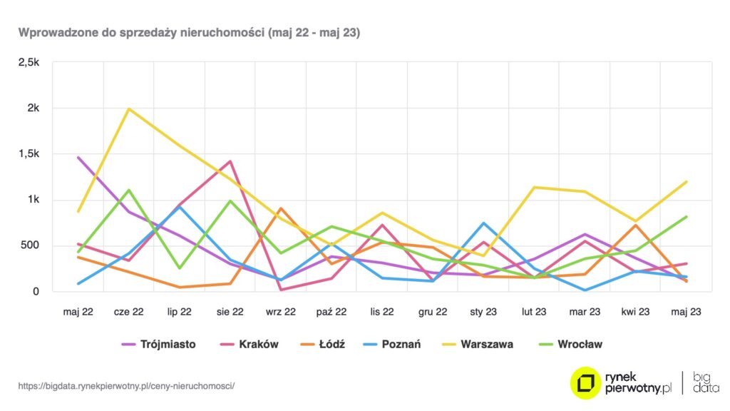 Z danych portalu RynekPierwotny.pl wynika, iż w maju br. liczba ofert mieszkań i domów w całej Polsce wyniosła 43 756. Oznacza to, iż w ujęciu miesięcznym wolumen ten uległ zmniejszeniu o 1,11%. “Analizując zmiany podażowe w największych miastach, zacznijmy od stolicy, w której do dyspozycji kupujących było 12 731 mieszkań i domów. 1 616 mieszkań i domów w tym czasie zostało sprzedanych, a w ich miejsce deweloperzy wprowadzili 1194 nowych ofert” – napisano w raporcie.