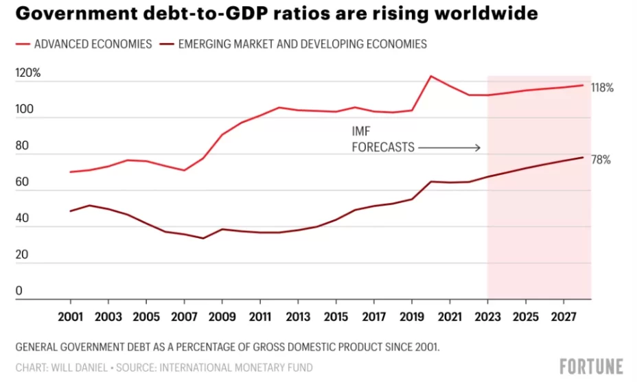 Dług państw w relacji do PKB potężnie wzrósł w ciągu ostatnich kilkunastu lat. Nie tylko w USA. Źródło: FortuneZ długiem nie ma żartów?