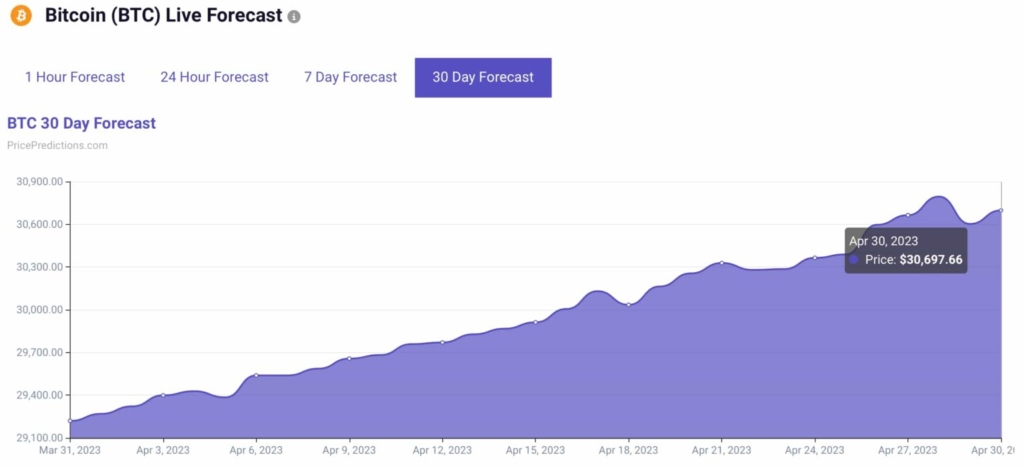 Bitcoin, największa z wszystkich kryptowalut w marcu wzrosła o 20% i o ponad 70% od początku 2023 roku. Alogrytmy sztucznej inteligencji nie przewidujodą wrócenia tego trendu. Kryptowalutowy portal Finbold 30 marca sprawdził modele alogrytmów 'machine learning’ na specjalnej platformie, która służy do szacowania trendu kryptowalut. Technologia AI przewiduje, iż BTC osiągnie poziomy cenowe powyżej 30 000 USD, do końca kwietnia. Poniższa prognoza oszacowała cenę Bitcoina na poziomie 30 697 USD na dzień 30 kwietnia 2023 roku. Modele algorytmów dają Bitcoinowi szansę na ok. 7% wzrost ceny w nowym miesiącu.