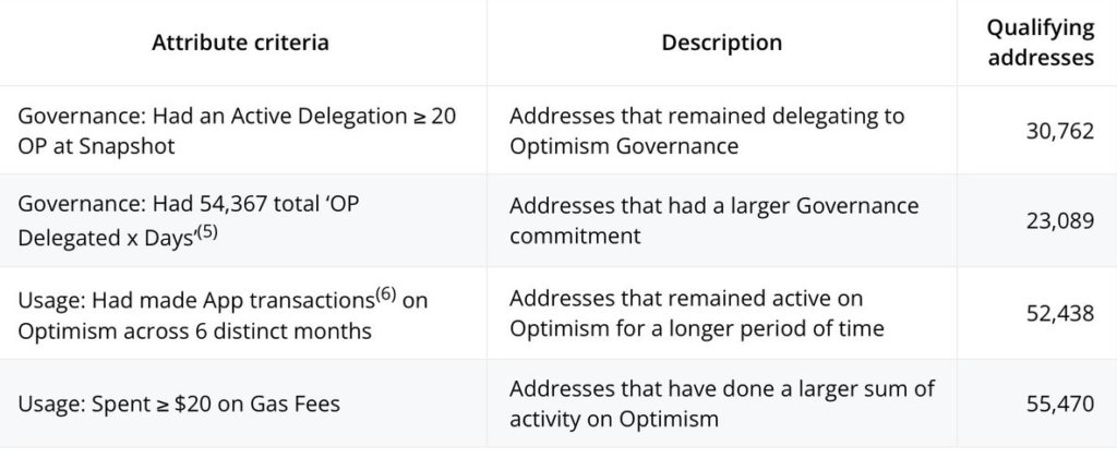 Istniały dwa główne kryteria, które decydowały o ilości przysługujących nam tokenów. Pierwszym z nich było 2000 dniodelegacji tokenów $OP (czyli np. jeden token przez 2000 dni, 200 tokenów przez 10 dni lub proporcjonalnie inaczej), a drugim wielokrotne korzystanie z sieci Optimism i wydanie na transakcje więcej niż szacunkowe koszty gazu jednej transakcji na Ethereum– przyjęto kwotę 6,10 USD.