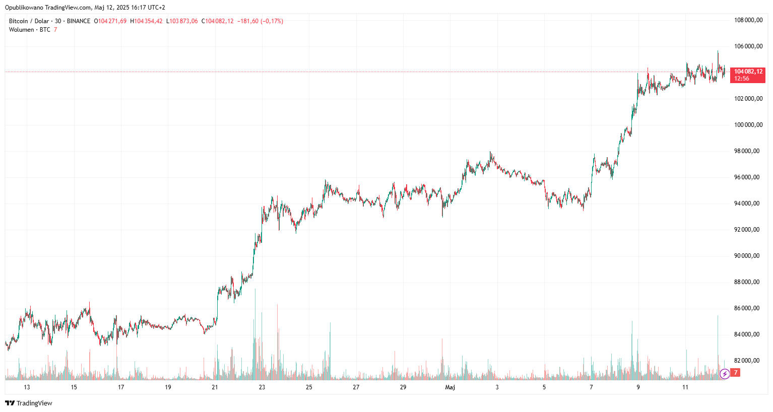 Obecny tydzień bitcoin rozpoczął mocnym wzrostem nieco ponad linię 105 000 USD. Liczni członkowie branży oczekują przebicia przez kurs BTC dotychczasowego ATH w postaci około 109 100 USD w najbliższym czasie.