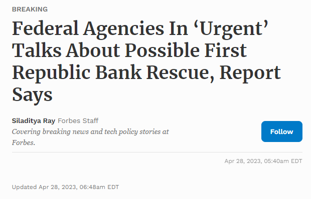 Jak informuje agencja Reutersa, ostatnio ujawniona ziejąca dziura w bilansie banku i ryzyko efektu systemowego / domina dla gospodarki spowodowała, iż przedstawiciele instytucji federalnych odpowiedzialnych m.in. za regulowanie rynku spotykają się właśnie w trybie pilnym. Tajemnicą poliszynela jest, iż chodzi o potencjalny pakiet lub plan ratunkowy dla upadającego lewiatana. Implozja banku First Republic oznaczałaby trzecią największą katastrofę bankową tego roku, po kolapsach Signature Bank i Silicon Valley Bank.