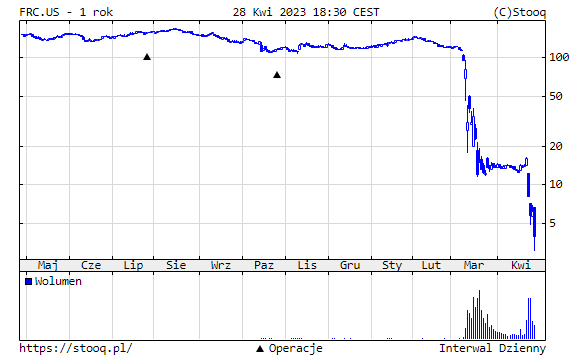 Piątek bynajmniej nie przyniósł oddechu dla akcji First Republic Bank. Łapiący noże pokaleczyli tylko ręce, licząc na przynajmniej krótkoterminowe odwrócenie trendu. Dziura w bilansie banku przez cały czas straszy i kilka wskazuje by miało się cokolwiek zmienić. Wycenie akcji nie pomogły też doniesienia Reutersa, iż agencje federalne Stanów Zjednoczonych spotykają się możliwie jak najszybciej w celu omówienia sytuacji i (potencjalnie) zaradzenia sytuacji przez celowy pakiet ratunkowy. Kurs spada właśnie o ok. 50%!