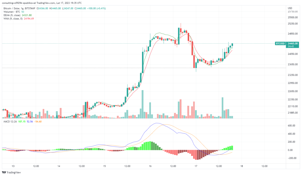 Następnie kurs BTC odbił się wspomnianego „sufitu” i zaliczył szybką korektę, która zatrzymała się na poziomie 23 360 USD. W chwili pisania tego tekstu kurs BTC jest notowany blisko wsparcia na poziomie 24 300 USD.