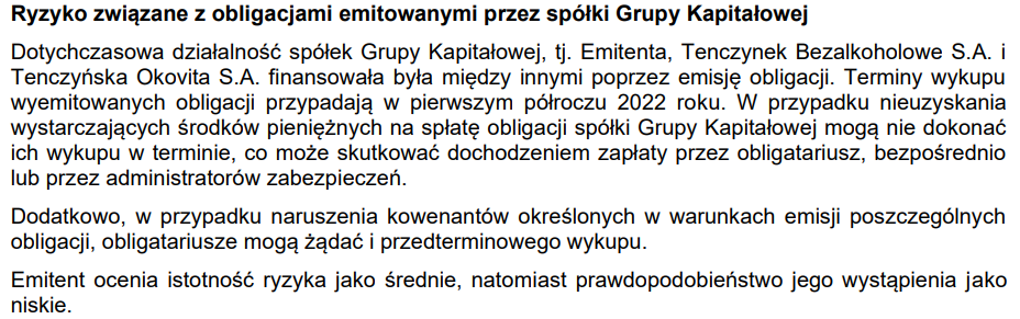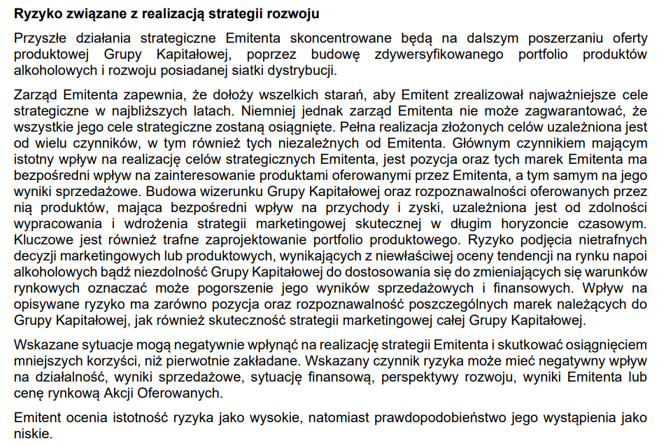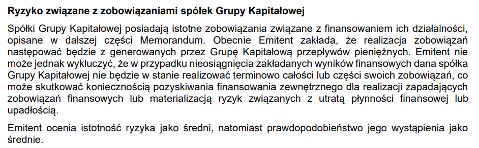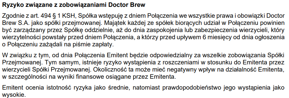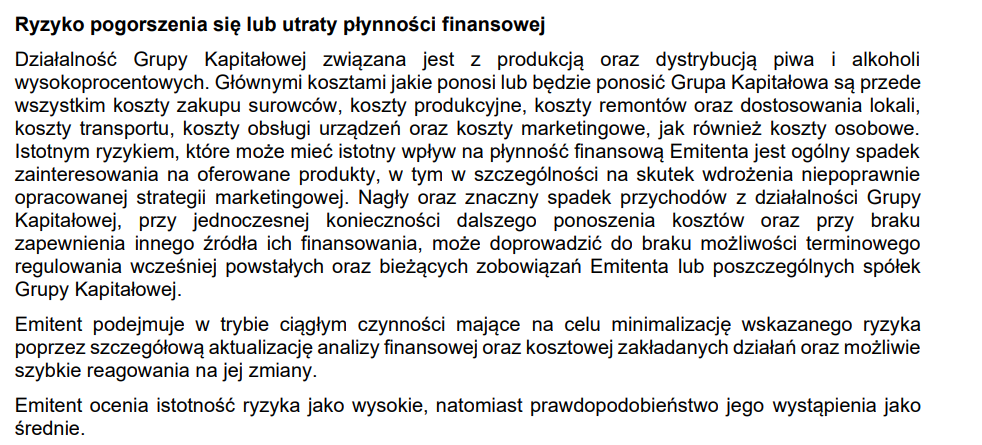 Podobnie sytuacja makroekonomiczna wg. zarządu stanowi dla spółki 'średnie’ ryzyko. Zgodzilibyśmy się z tym, gdyby była w pełni rentowna. Jakie ryzyko dla nierentownego biznesu stanowi kryzys gospodarczy czy pogorszenie koniunktury? Odpowiedź jest oczywista – olbrzymie. Czy w wmomencie pisania memorandum MPWiW było w pełni rentowne i generowało pozytywne przepływy pieniężne? Dług Doctor Brew dołożył się do sytuacji płynnościowej grupy. Kolejny paradoks, w memorandum – MPWiW okresliło ryzyko niespłacenia obligatariuszy jako 'Niskie’. Z jakich środków miały być finansowane te płynne spłaty? Jak oszacowano wolumeny sprzedażowe? Czy może miało być to finansowane portfelami nowych inwestorów? Spółka co do zasady powinna w analizie ryzyka powinna zakładać realny scenariusz z marginesem błędu, na swoją niekorzyść. Tego rodzaju 'najlepszych praktyk’ w naszej subiektynwje ocenie zabrakło.