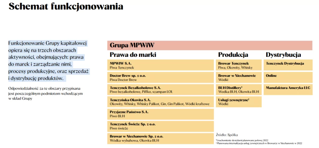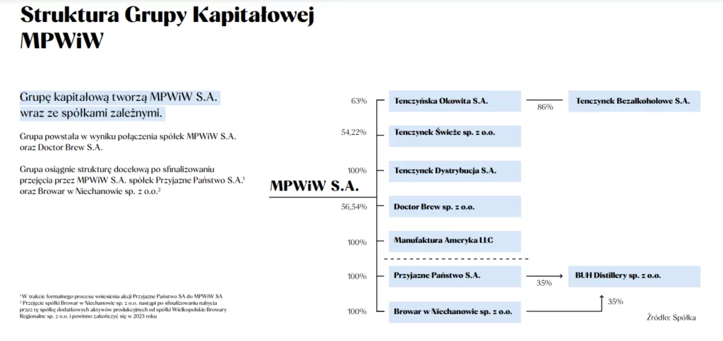 Struktura grupy MPWiW oraz jej spółki zależne. Fuzja z Doctor Brew dokonała się w marcu 2022. Źródło: MPWiW IPO 2022Tenczynek i Borwar w Niechanowie – najbardziej wartościowe zabezpieczenie MPWiW?