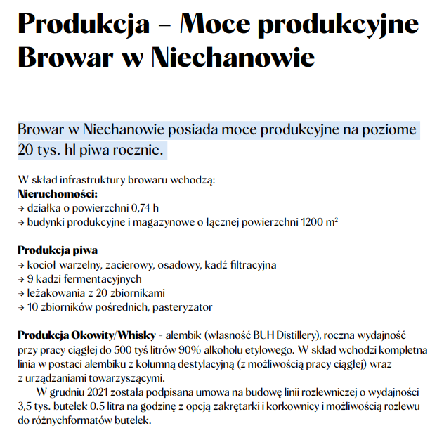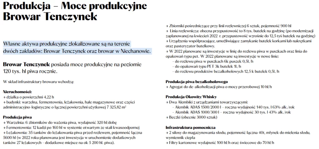 Źródło: IPO MPWiW 2022Jak wygląda potencjalne zabezpieczenie wartości księgowej grupy? Spójrzmy na aktywa trwałe, które znamy. Założyliśmy, iż wymieniony przez grupę sprzęt nie jest dzierżawiony i został zakupiony na własnosć. W obu browarach widzimy łacznie prawie 5 hektarów gruntów. Budynki produkcyjne i magazynowe o powierzchni ok. 8500 m2 oraz: