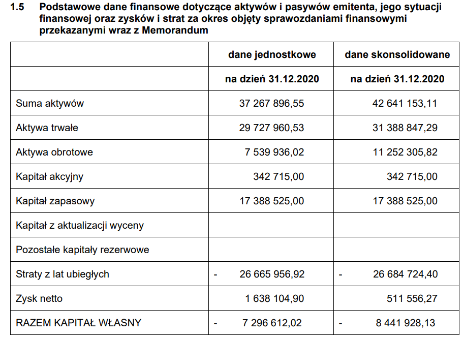 Jak to możliwe więc by miała dodatni zysk netto, który jest wynikiem zysku brutto pomniejszonego o podatki? W tabeli widoczna jest strata na działalności operacyjnej wynosząca prawie 6,4 mln. dla skonsolidowanego raportu. Przypomnijmy, po dodaniu przychodów i odjęciu kosztów od wyniku sprzedaży netto uzyskuje się zysk lub stratę na działalności operacyjnej. Dodatni zysk netto przy stracie operacyjnej wydaje się czymś abstrakcyjnym. Zgodnie z memorandum z marca 2022 kapitał zapasowy spółki (na ew. porkycie strat) miał wynieść 17,388 mln PLN wobec 342,715 PLN kapitału zakładowego. W takim wypadku mielibyśmy ok. 47 mln PLN co stanowiłoby ok. 33% zainwestowanych pieniędzy inwestorów.