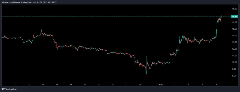 Jak wspominaliśmy w ostatnim artykule, po fali dramatycznych spadków Solana ponownie zaczęła dawać znaki życia. Jej kurs na moment powstawania tego tekstu wynosi ok. 17 USD za monetę, co oznacza wzrost o ponad 100% w porównaniu do minimów z grudnia 2022 r.