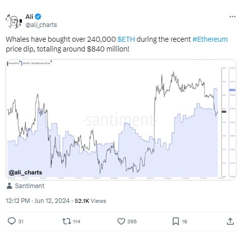 Źródło: https://x.com/ali_charts/status/1800833424770621888Ali Martinez, popularny na portalu X analityk, zauważył zwiększoną aktywność wielorybów. To o tyle istotne, iż wieloryby zwykle wykorzystują spadki cen do gromadzenia większej ilości tokenów. Dane dotyczące łańcucha z Santiment ujawniły, iż 10 największych portfeli giełdowych odnotowało spadek zasobów ETH o 8,6%, gdy inwestorzy przenieśli aktywa do portfeli prywatnych.