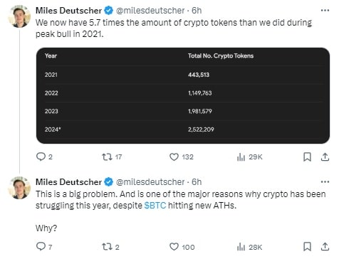 Źródło: https://x.com/milesdeutscher/status/1803071762818646452Deutscher wskazuje, iż „tylko od kwietnia wprowadzono na rynek ponad 1 milion nowych tokenów kryptograficznych”. Ten masowy napływ nowych tokenów doprowadził do tego, co nazywa „dyspersją altcoinów”. Analityk porównuje to zjawisko do inflacji w gospodarce.