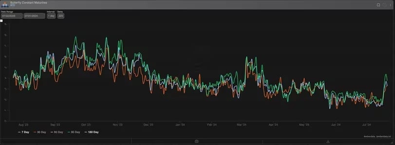 Aktywność na rynku opcji notowanych na Deribit i raportowanych przez Amberdata pokazuje zauważalny wzrost tzw. „indeksu motyla”, który mierzy zmienność opcji kupna i sprzedaży out-of-the-money (OTM) notowanych w odległości od bieżącej ceny rynkowej bitcoina w stosunku do opcji at-the-money (ATM) tj. najbliższych ceny spot. Dopóki Trump pozostaje faworytem, według rynków tylko kwestią czasu jest, aż wyzwoli jakiś 'pro Bitcoinowy’ katalizator. Greg Magadini, dyrektor ds. instrumentów pochodnych w Amberdata zasugerował jasno. Notowania rynku opcji sugerują, iż coś się wydarzy.