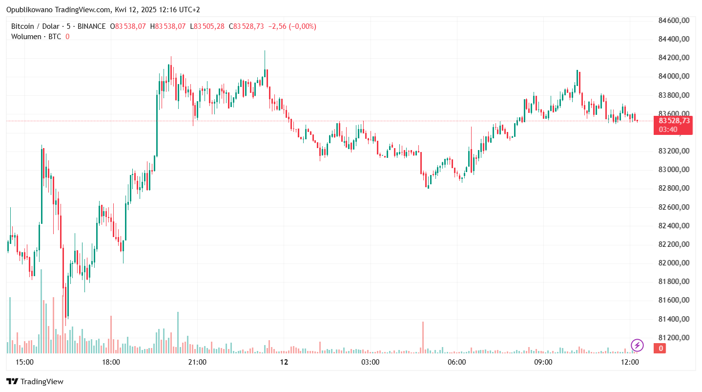 W nocy z 11 na 12 kwietnia największa z kryptowalut zdołała odzyskać najważniejszy poziom 84 tys. dolarów, jednak determinacja byków nie była na tyle silna, aby go utrzymać. W momencie pisania tego artykułu za 1 BTC płaci się na giełdach 83 500 dolarów.