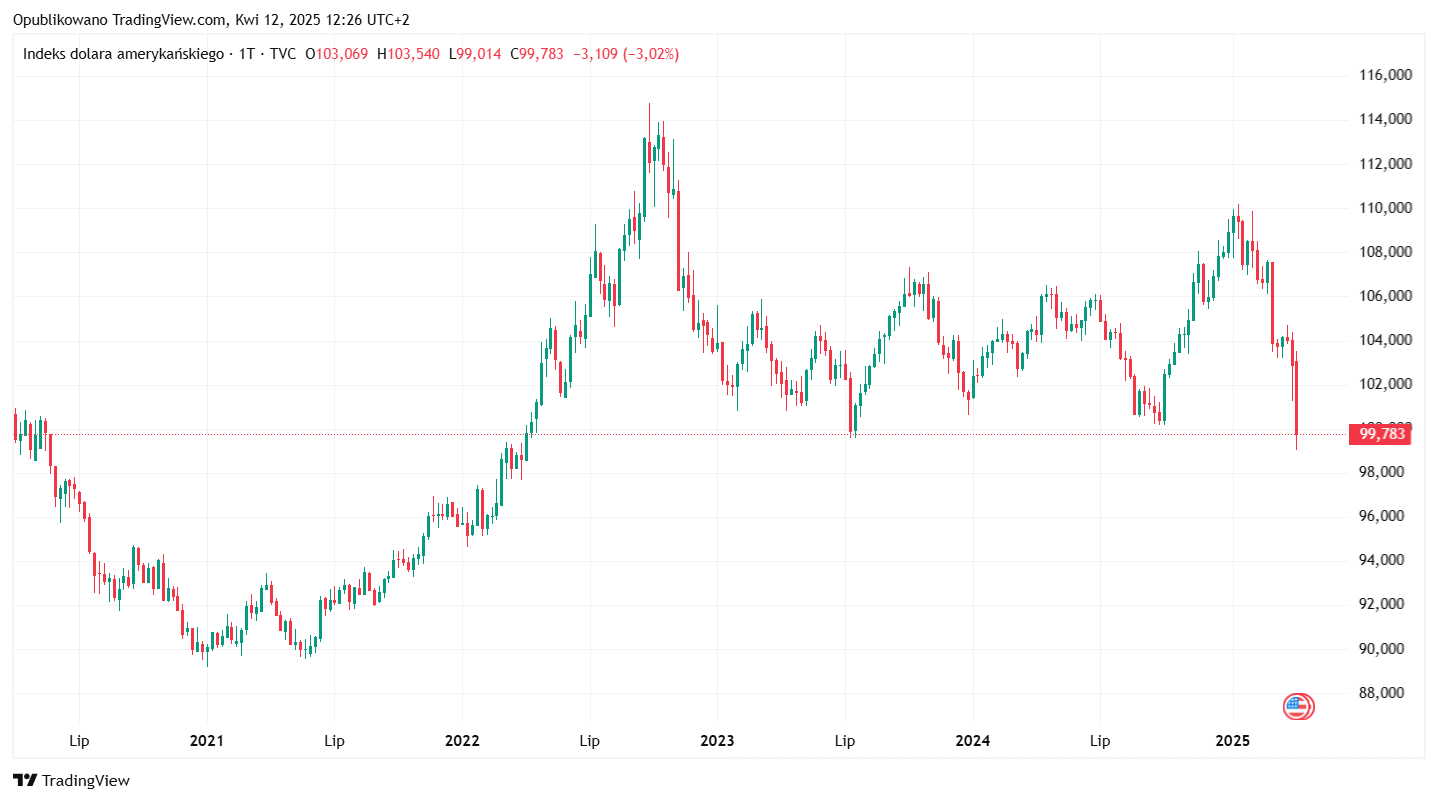 - Wartość indeksu dolara amerykańskiego (DXY) po raz pierwszy od 2 lat spadła poniżej 100 punktów.
