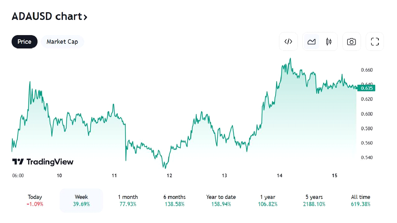 Cardano (ADA) odnotował niezwykły wzrost, a jego cena znacznie wzrosła w krótkim okresie. Ten trend wzrostowy jest częścią szerszego trendu wzrostowego na rynku kryptowalut. Całkowita wartość zablokowana na blockchainie Cardano wzrosła, przekraczając 430 milionów dolarów, co stanowi znaczny wzrost z 50 milionów dolarów na początku roku.