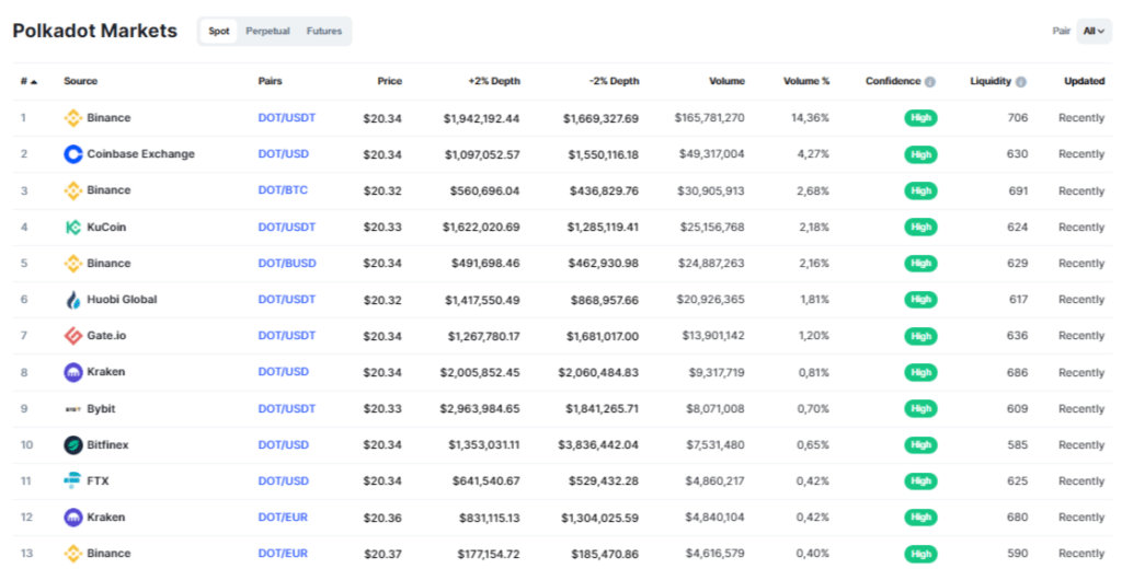 przykład listingów na giełdach (polkadot); źródło: linkProstym sposobem na zaoszczędzenie czasu w fundamentalnej analizie projektów jest śledzenie monet/tokenów notowanych na giełdach.