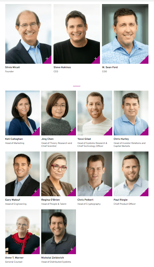 przykład zespołu twórców i deweloperów blockchaina Algorand; źródło: linkJednym z najważniejszych czynników przyciągających uwagę do projektów są założyciele i zespół stojący za projektem.
