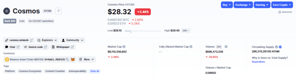 przykład wskaźników w czasie rzeczywistym (Cosmos); źródło: linkStrony internetowe takie jak CoinMarketCap lub CoinGecko udostępniają wnikliwe informacje na temat wskaźników finansowych monet/tokenów: