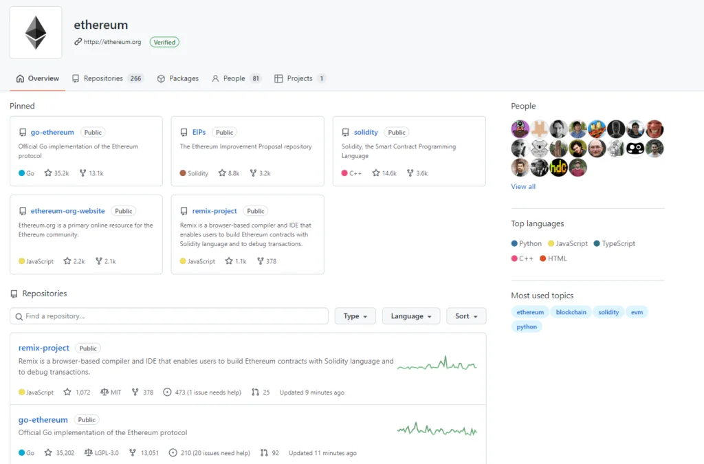 przykład repozytorium kodu źródłowego (Ethereum); źródło: linkProjekty blockchain powinny być open-source. Dzięki temu każdy użytkownik projektu może przeglądać kod w celu oceny jego jakości i poziomu bezpieczeństwa. Wymaga to oczywiście pewnego poziomu wiedzy technicznej na temat programowania i narzędzi. Oto, jakie przydatne informacje można uzyskać z repozytoriów typu open source: