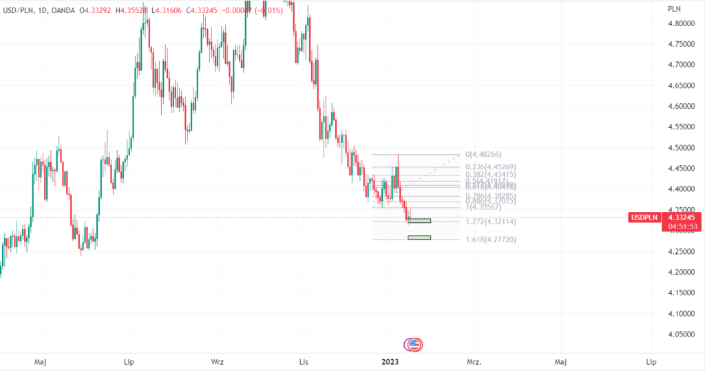 Wykres dniowy USD/PLN. Podczas szukania okazji na tej parze warto zmierzyć ostatnią falę wzrostową na wykresie dniowym. w tej chwili wybraniany jest interesujący poziom 1.272, ale często jest to pierwsza „pułapka”, która jest chwilowo obroniona, a dalej jest zejście do 1.618 mierzenia Fibonacciego. Z tego powodu warto pamiętać o poziomie 4.28 na USD/PLN.