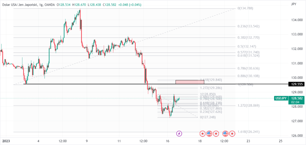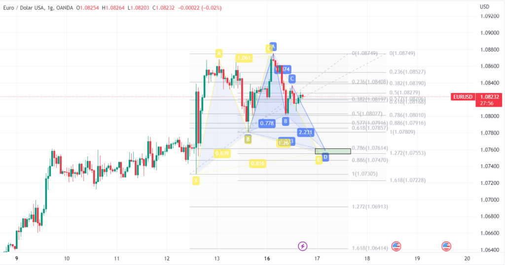 Poziom w okolicach 1.07600 odpowiada mierzeniu wewnętrznego Fibonacciego – odpowiednio jest to wartość 0.786 oraz 1.272 – w zależności który układ się mierzy. W obu przypadkach na tych mierzeniach występuje układ harmoniczny, więc można prognozować odbicie wzrostowe w tym rejonie cenowym. Zasięgiem dla dalszych wzrostów byłoby wybicie ponad obecne szczyty, czyli ponad 1.08800.