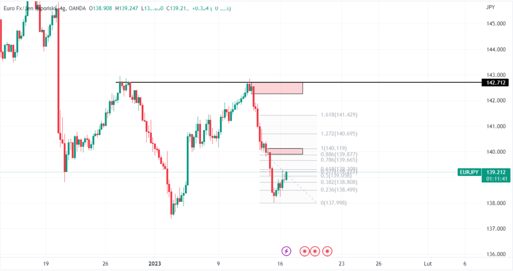 Na wykresie Euro / Jen Japoński na interwale 4-godzinnym widzimy w ostatnich godzinach podbicie wzrostowe. Kolejnymi strefami wartymi obserwacji są zaznaczone poniżej poziomy. Pierwszą strefą na potencjalne podłączenie się do trendu spadkowego są okolice 140.100 – poziom ten wypada na 0.886 mierzenia Fibonacciego oraz jest tu utworzona strefa podażowa z ostatniego piątku.