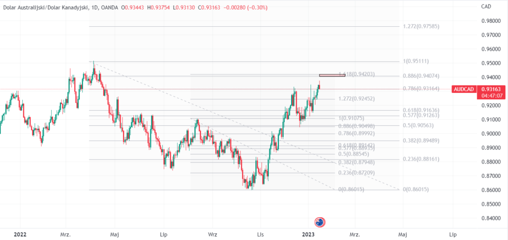 Na wykresie dniowym Dolar Australijski / Dolar Kanadyjski cena zbliża się do bardzo interesującego poziomu w kontekście potencjalnego odwrócenia trendu. Na tej parze walutowej trend wzrostowy trwa praktycznie od połowy października i teraz zbliża się do mocnej zapory cenowej. Podwójne mierzenie 1.618 oraz 0.886 z większego przedziału czasowego sugeruje, iż jeżeli te dwa mierzenia występują bardzo blisko siebie (klaster Fibo) daje to większe potwierdzenie na możliwą reakcje odwrotną, czyli w tym przypadku reakcję spadkową.