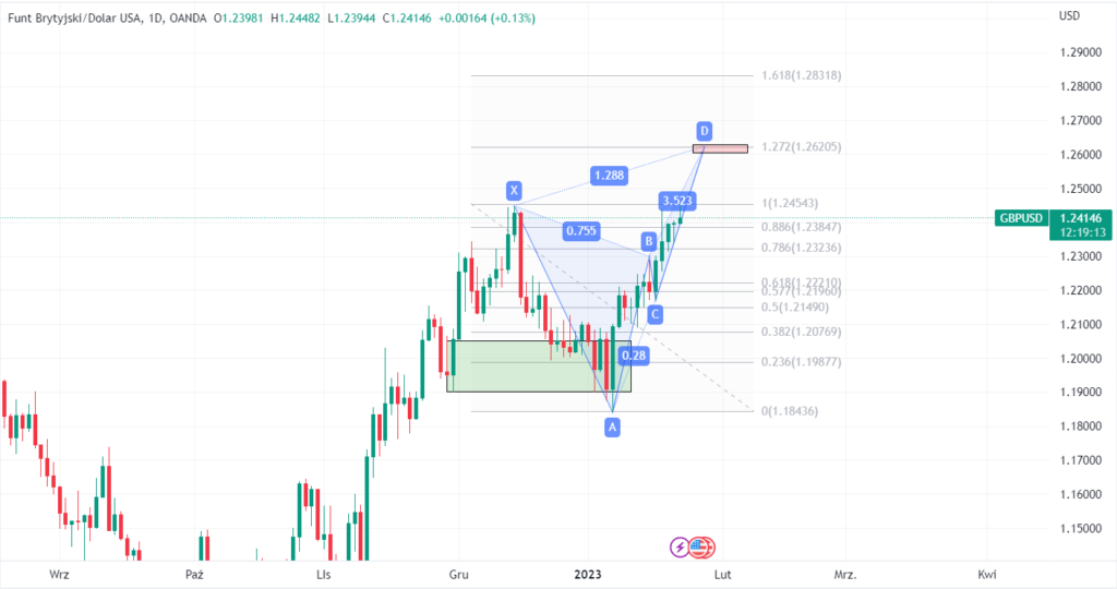 Na ten moment bardzo możliwe jest podejście pod 1.272 mierzenia Fibonacciego, co pozwoli wypełnić układ harmoniczny Motyla z punktem B na 0.786 oraz D na poziomie właśnie 1.272. W tym rejonie cenowym prawdopodobne jest, iż pojawi się reakcja spadkowa.
