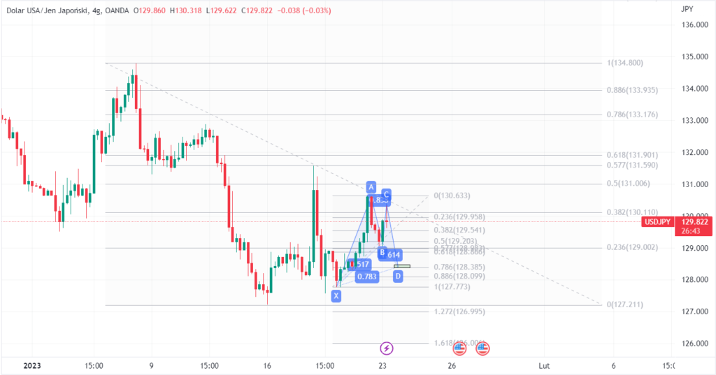 Na wykresie 4-godzinnym Dolar USA / Jen Japoński widać dwie rzeczy. Na interwale 4h cena powinna po raz kolejny zaatakować poziom 0.618, czyli okolice 132. Z drugiej strony w przypadku zejścia z obecnego pułapu cenowego niżej, może być możliwość podłączenia się do tego wzrostu w punkcie D na mierzeniu 0.786 z mniejszego interwału czasowego (1-godzinny). Są to okolice 128.300.