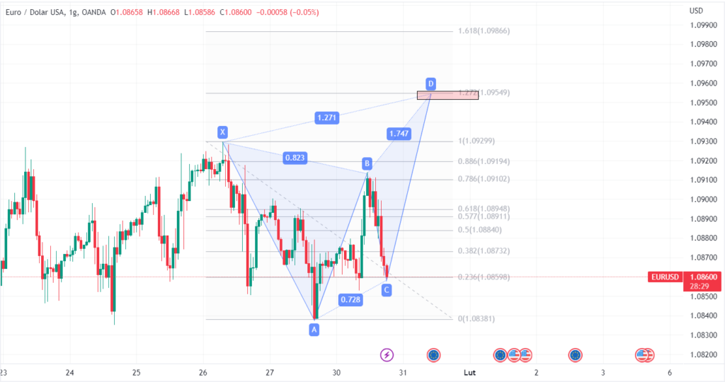 Na notowaniach Euro / Dolar USA również widać interesujące poziomy i układ harmoniczny z punktem D na 1.272. EUR/USD jest cały czas w trendzie wzrostowym, notując po drodze małe korekty. W punkcie D można spodziewać się reakcji spadkowej. Należy jednak pamiętać, iż fala B-C może się jeszcze wydłużyć, ale układ jest aktualny, dopóki punkt A nie zostanie wybity przez C.