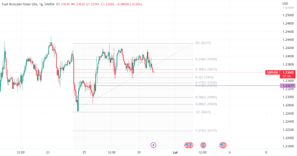 Funt Brytyjski / Dolar USA zmierza w kierunku 0.618. Wcześniej cena dwa razy broniła poziom 0.5, który również jest bardzo istotny i często respektowany, jednak 0.618 można powiedzieć, iż pozostało częściej honorowany. Z tego poziomu możliwa jest dalsza kontynuacja trendu wzrostowego w kierunku 1.25000.