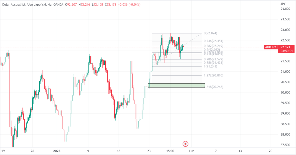 Na 4-godzinnym wykresie Dolar Australijski / Jen Japoński widać w ostatnich dniach odbicie wzrostowe. Po przełączeniu na wykres liniowy jednak można zauważyć, iż zrobił się tymczasowy podwójny dołek, który rynek „lubi” wybijać i z tego powodu możliwa jest korekta do poziomu 1.618, gdzie również znajduje się strefa popytowa. Z tych rejonów można wyszukiwać podłączenia się pod wzrost ceny.