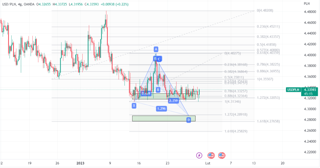 Na wykresie dniowym USD/PLN widać, iż obecny poziom wsparcia i Fibo, który jest utrzymywany od 2 tygodni notuje wiele testów. Po przetestowaniu tego poziomu tyle razy, bardzo możliwe jest zejście niżej do kolejnego poziomu Fibonacciego. W rejonach 4.28200 zbiegają się dwa mierzenia 1.272 z mniejszego oraz 1.618 z większego mierzenia. Na mniejszym zakresie cenowym na poziomie 1.272 wypada punkt D z możliwością realizacji układu harmonicznego, dlatego w tych obszarze można spodziewać się kolejnej reakcji wzrostowej oraz szukania okazji w kontekście dłuższego terminu.