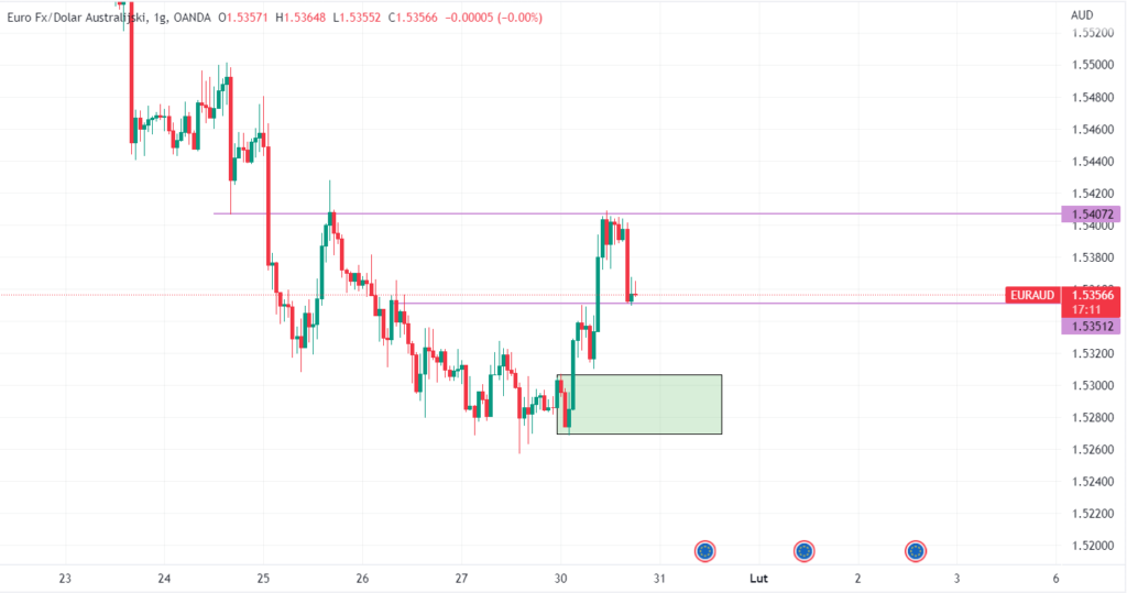 Na Euro / Dolar Australijski cały czas jest trend spadkowy. Ostatnio na wykresie 4-godzinnym cena zrobiła jednak nowy, wyższy szczyt, co może sugerować lekkie podbicie cenowe, jednak przed doszukiwaniem się ewentualnego podbicia wzrostowego, cena może zejść do strefy popytowej 4-godzinnej w rejonach 1.5300 – 1.52700. Z kolei na wykresie 1-godzinnym widać jak cena respektuje najważniejsze poziomy.
