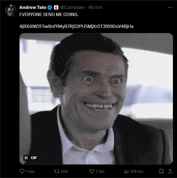 Nie są to pierwsze ekscentryczne, krótkoterminowe wizyty Tate w świecie kryptowalut. Influencer „reklamował” też blockchain Venom (gdzie powstało wiele memicznych kryptowalut nawiązujących do kickboxera, jednak bez sukcesu rynkowego), oraz tokeny takie jak ROOST na sieci BASE, czy GERMANY.