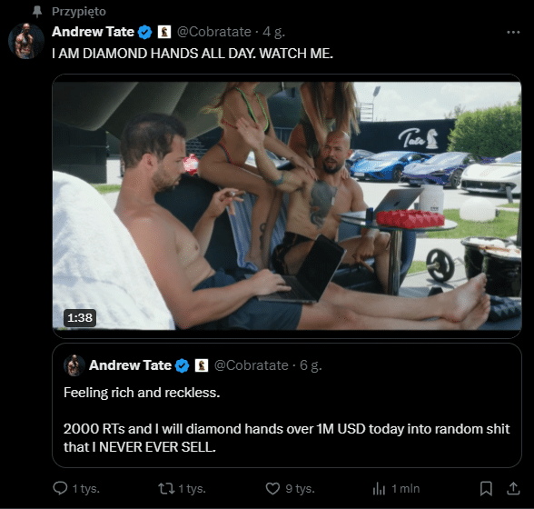 Seria tweetów rozpoczęła się dzisiaj, 7 czerwca, ok. godziny drugiej po południu czasu polskiego. Andrew Tate, były kickboxer i influencer z „manosfery” znany m.in. z problemów z prawem oraz pasji do kryptowalut, opublikował tweet, na którym odpoczywa na basenie (?) ze swoim bratem Tristanem i modelkami, „grożąc”, iż „zakorkuje Solanę” inwestując w losowe kryptowaluty. Zarzeka się też, iż ma „diamentowe ręce”, i nie sprzeda choćby kiedy token wzrośnie, ani o ile spadnie.
